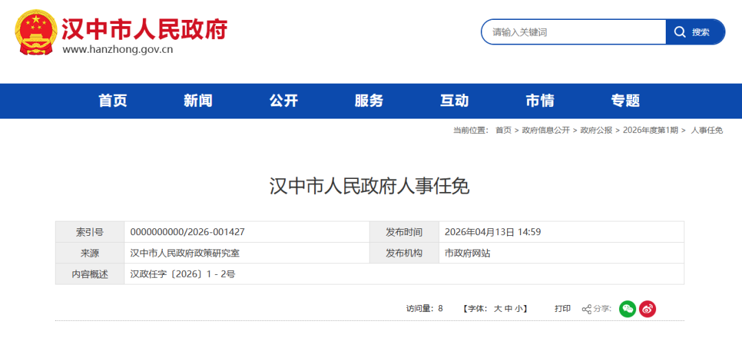 4月13日,汉中市人民政府网站发布一批人事任免: