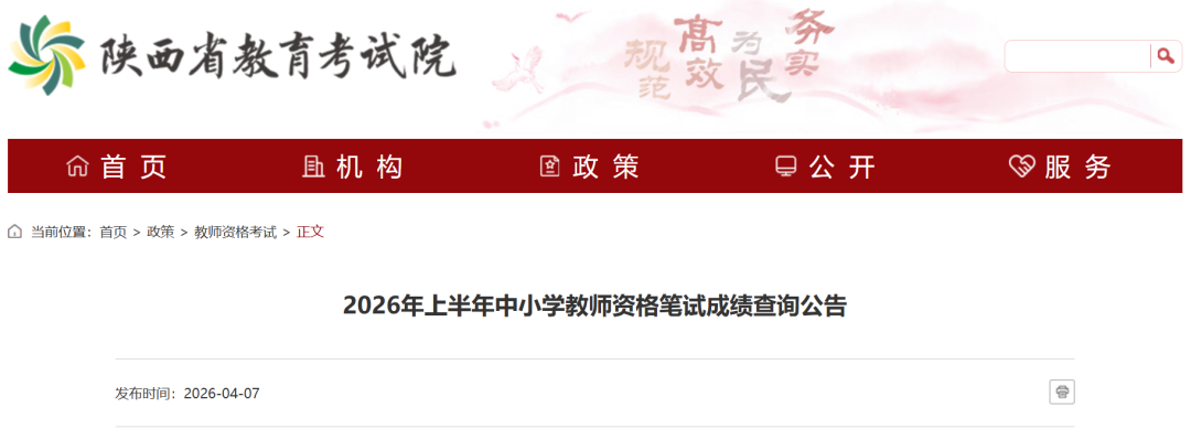 近日,陕西省教育考试院发布2026年上半年中小学教师资格笔试成绩查询公告,内容如下: