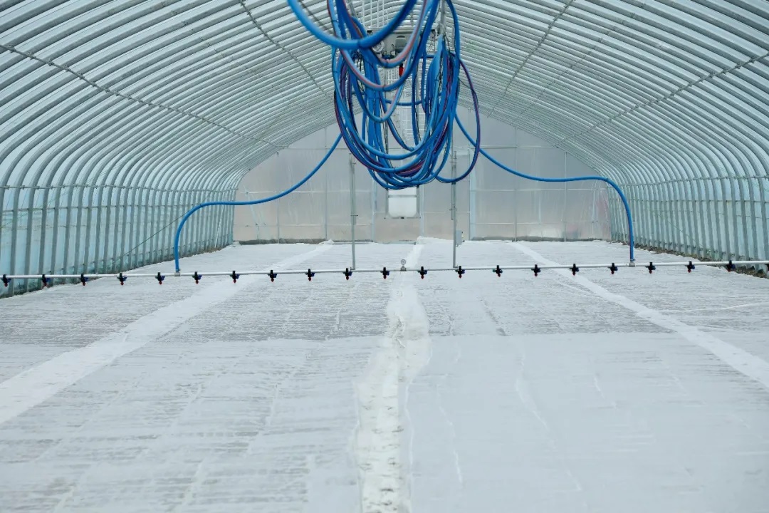 与此同时,位于上盐湾镇的伏才种植家庭农场也在进行钵体育秧,农户们分工协作、配合默契,全自动育苗机匀速作业,一盘盘营养钵整齐排列。随着大棚内自动喷淋系统定时开启,细密水雾均匀洒落,为稻种提供适宜湿度,让育苗环节更加省时省力,也最大限度保障了稻种发芽生长的均匀性。