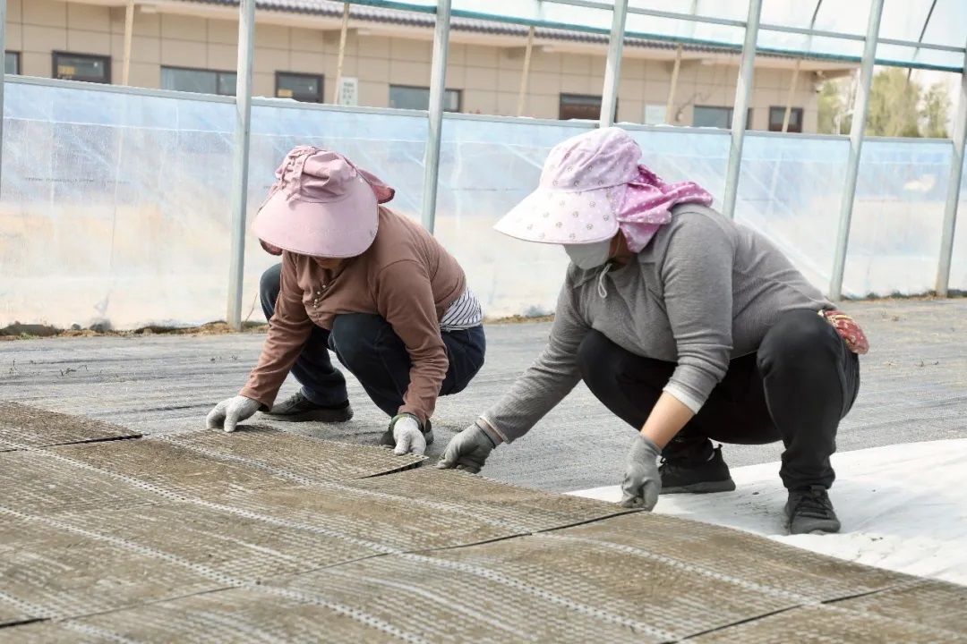工人们将一盘盘营养钵摆放整齐