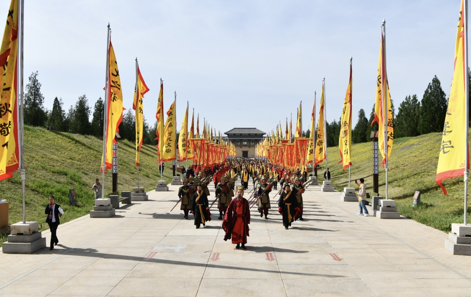 春和景明,龙旗招展,古柏葳蕤,礼乐交融。上午9:30,仓颉庙迎宾广场举行典前序礼仪式,参加活动的特邀嘉宾、仓颉文化研究会代表、仓颉文化传承人代表、仓颉后裔代表、社会各界代表及中央、省、市新闻媒体记者行入仪门礼后,心怀虔诚入城进行大道行礼仪式。