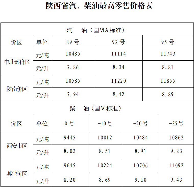 4月21日,陕西省发展和改革委员会网站发布陕西省成品油价格调整通告。根据现行成品油价格形成机制,4月22日起陕西省汽、柴油价格相应下调,92号汽油和0号柴油最高零售价格每升分别下调0.44元和0.45元。调整后各价区汽、柴油最高零售价格为:92号汽油西安市场每吨11114元(8.34元/升),中北部价区执行西安市场价格,陕南价区每吨11220元(8.42元/升);0号柴油西安市区每吨9445元(8.03元/升),省内其他市场每吨9645元(8.20元/升)。成品油零售企业可在不超过汽、柴油最高零售价格的情况下,自主制定具体零售价格。