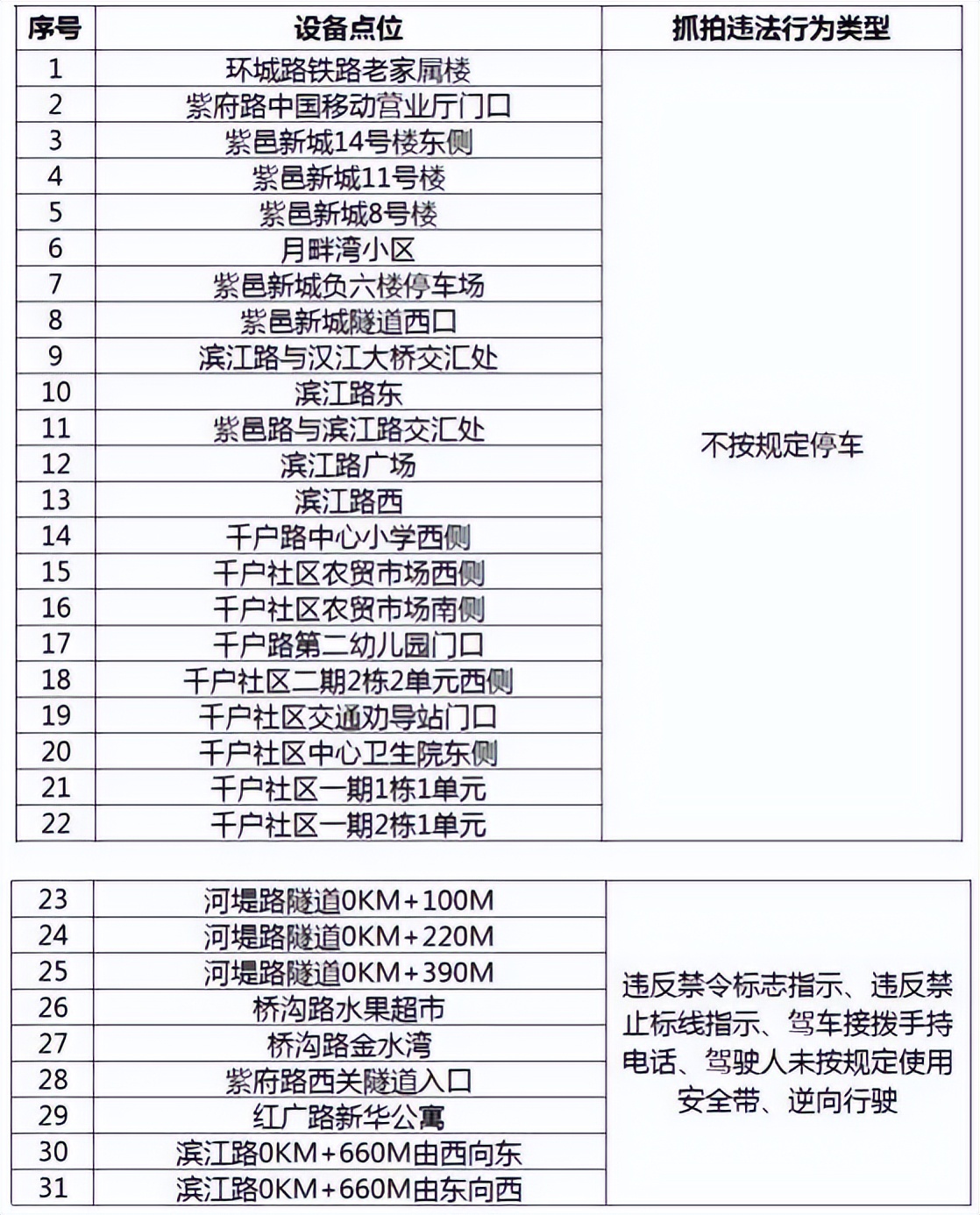 此次新增的监控点位覆盖城区多个重点区域与路段,主要包括紫邑新城、月畔湾小区、千户社区、河堤路隧道、桥沟路、紫府路、红广路及滨江路等。设备将重点抓拍不按规定停车、违反禁令标志/标线指示、驾车接拨手持电话、驾驶人未按规定使用安全带、逆向行驶等交通违法行为。