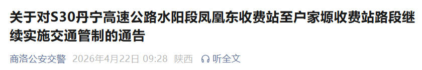 陕西商洛交警等部门4月22日联合发布通告,S30丹宁高速公路水阳段凤凰东至户家塬收费站间,因桥梁施工需要,自4月29日至12月31日期间继续双向封闭,禁止所有车辆通行。