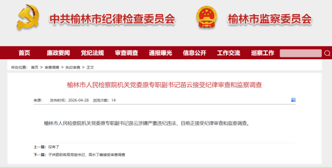榆林市人民检察院机关党委原专职副书记苗云涉嫌严重违纪违法,目前正接受纪律审查和监察调查。
