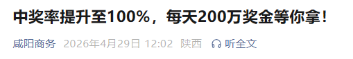 5 月 1 日零时起,咸阳市有奖发票试点活动第四期将正式上线。本期每日奖金池由 100 万元提高至 200 万元,线上即验即奖中奖率提升至 100%。