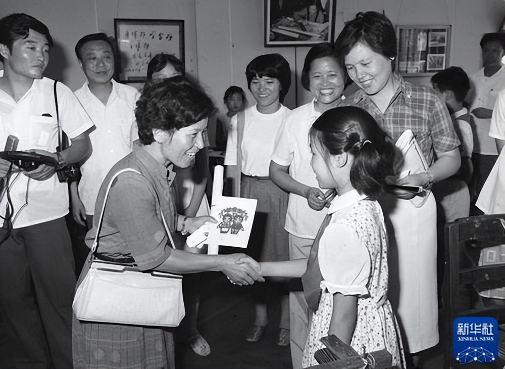 美穗子一家1980年7月22日至24日在上海参观访问。图为上海市少年宫小朋友向美穗子赠送表现中日友好的剪纸。新华社记者张刘仁摄