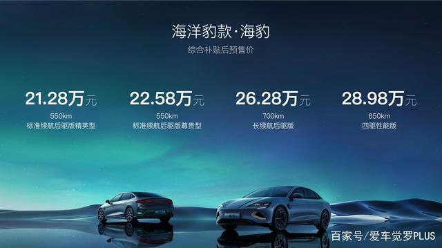 作为纯电车型,海豹的续航能力备受关注。海豹共推出2022款550Km标准续航后驱版精英型、2022款550Km标准续航后驱版尊贵型、2022款700Km长续航后驱版和2022款650Km四驱性能版4款车型,预售价格区间为21.28万-28.98万元。