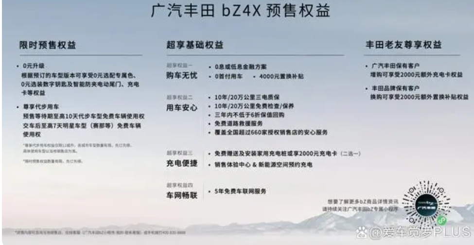 购买广汽丰田bZ4X的消费者,还可以享受到10年或20万公里三电质保、10年或20万公里免费检查/保养、三年内不低于6折保值回购、免费赠送及安装家用充电桩或享2000元充电卡(二选一)、以及5年免费车联网服务等等众多超享权益。