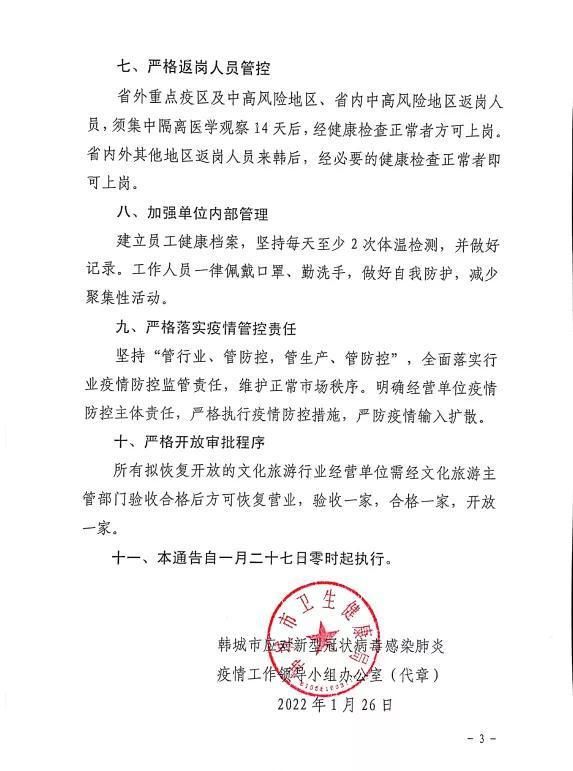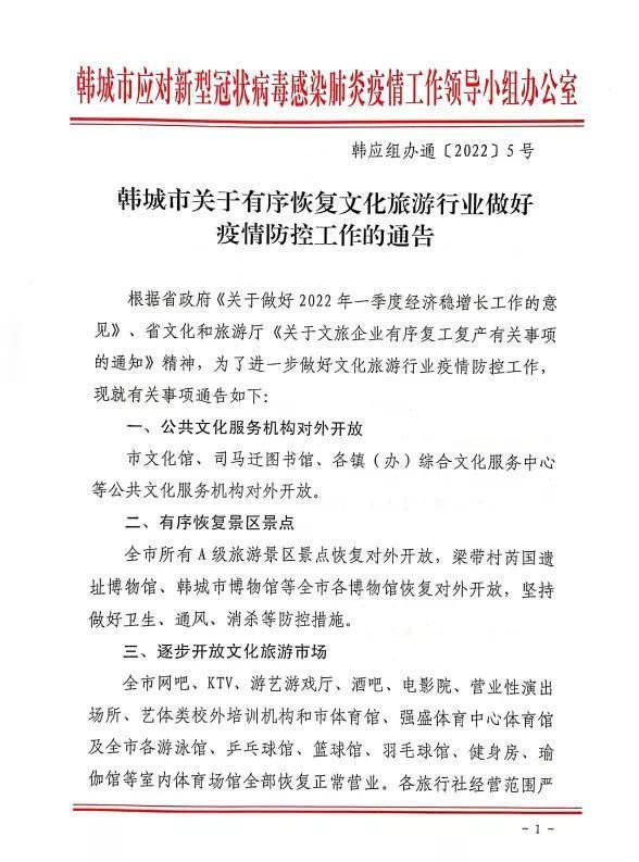 以此同时,韩城市所有A级旅游景区景点恢复对外开放,梁带村芮国遗址博物馆、韩城市博物馆等全市各博物馆恢复对外开放,坚持做好卫生、通风、消杀等防控措施。全市网吧、KTV、游艺游戏厅、酒吧、电影院、营业性演出场所、艺体类校外培训机构和市体育馆、强盛体育中心体育馆及全市各游泳馆、乒乓球馆、篮球馆、羽毛球馆、健身房、瑜伽馆等室内体育场馆全部恢复正常营业。