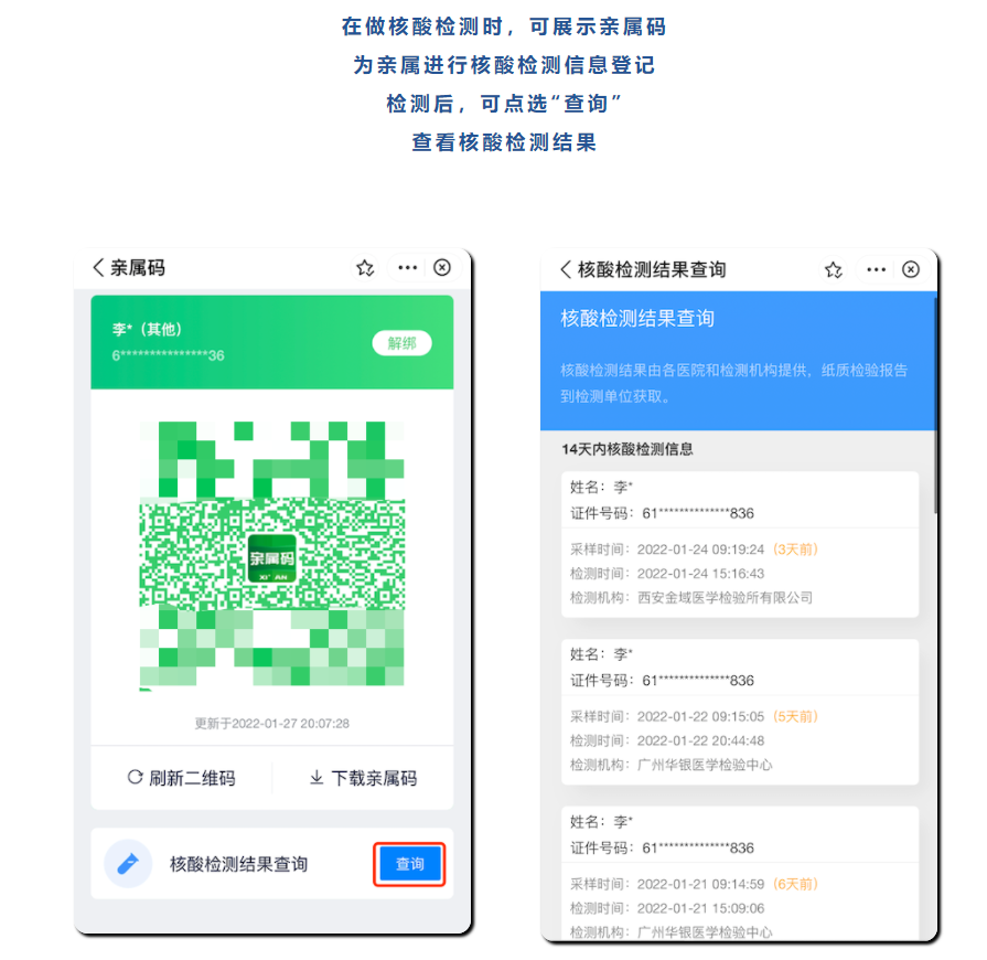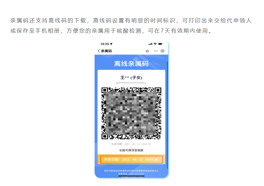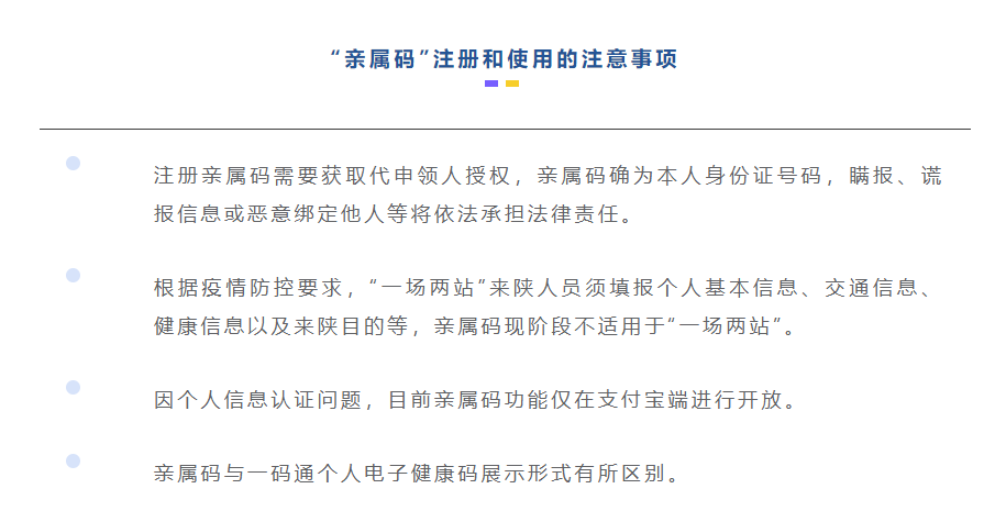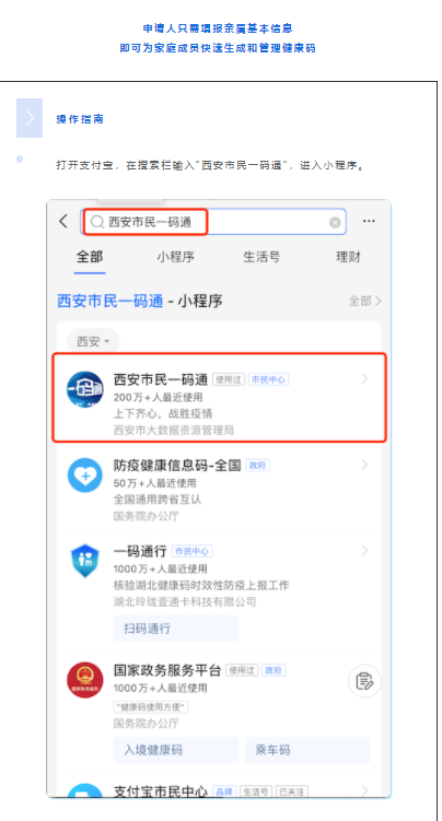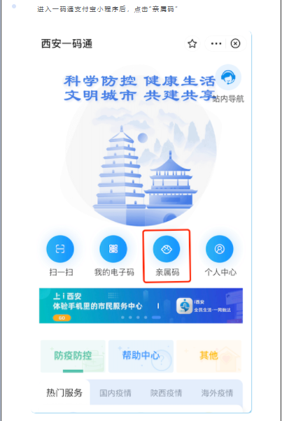 3月16日,为配合西安市开展的大规模核酸检测工作,解决许多小孩、老人没有或不会使用智能手机,无法注册一码通的问题,西安市民一码通在支付宝小程序上线了亲属码功能。