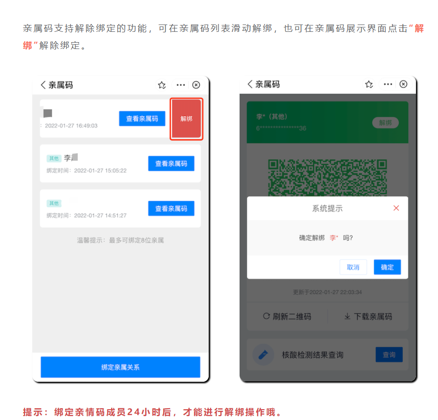 广大市民朋友可以为您家中的老人、孩子申领亲属健康码(亲属码),进行核酸检测及查询核酸检测结果。亲属码功能暂时仅支持一码通支付宝端小程序进行使用,由已拥有一码通的用户为家里的老人或小孩申请,使用时可以由一码通用户本人陪同亲属码用户使用,也可通过离线下载保存至手机相册或打印出来使用。
