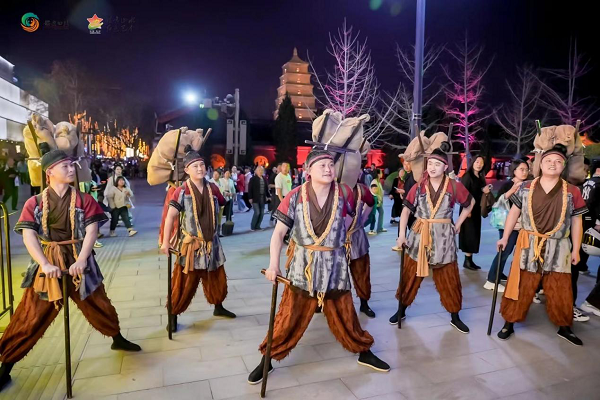 随后的“春日漫步,蜀你最美”主题巡游环节中,巴中“背二哥”演员们背着传统背架,手拿木杵,唱响《巴山背二歌》,在享誉全国的大唐不夜城向游客们展示国家级非物质文化遗产的独特风采。