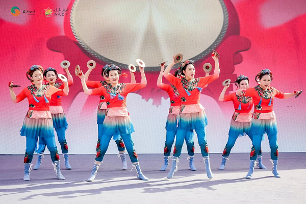 带有浓郁巴中地方特色的演出吸引了现场的人群。《打亲家》舞蹈以其独特节奏、丰富色彩和鲜明民族风格,生动呈现出巴山婚俗文化的魅力。《翻山铰子》则是通过独特的挥舞和击打动作,为现场观众带来了一场视听盛宴。