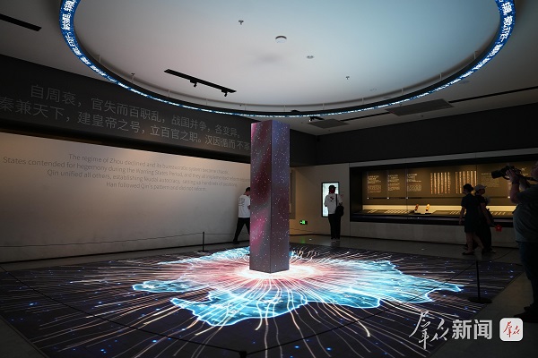 走进“天下同一——秦汉文明主题展”展厅,《一天下》多媒体装置通过动态影像直观呈现秦始皇初创“大一统”的政治思想;全息投影技术更打破单向观赏模式,观众可与虚拟古人行揖礼,让历史体验从“观看”升级为“参与”。