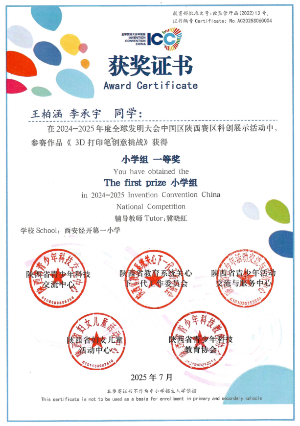近日,2024—2025学年全球发明大会中国区陕西赛区竞赛圆满收官。西安经开第一小学3D打印社团的15名参赛选手,凭借出色的创新思维与实践能力,实现全员获奖。其中,4人荣获一等奖,4人荣获二等奖,7人荣获三等奖。同时,该校2名指导教师获评“优秀指导教师”称号。