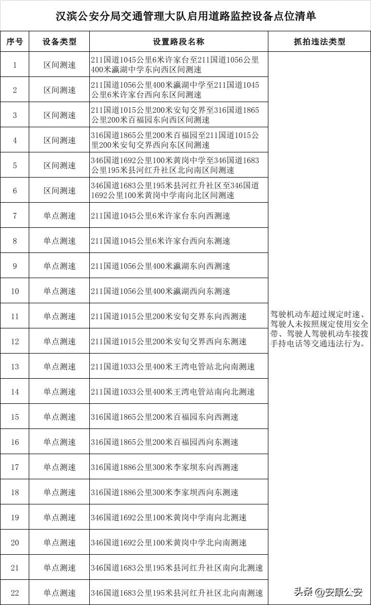 近日,安康市公安局汉滨公安分局交通管理大队发布《关于启用G211、G316、G346国道驾驶机动车超过规定时速等道路交通违法行为抓拍设备的通告》。