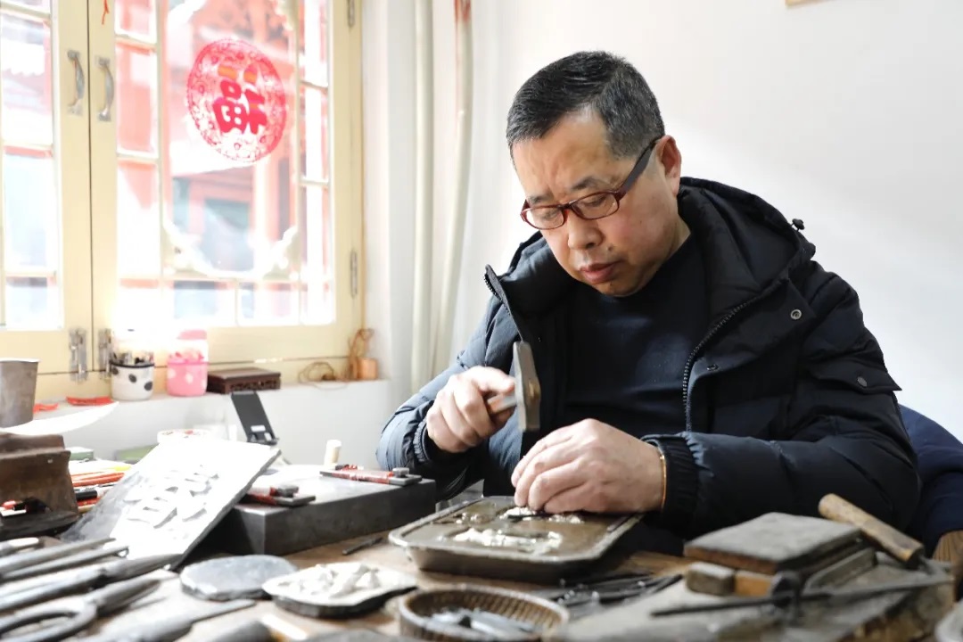 榆阳区非遗银匠项目代表性传承人杨伟慧正在打磨银饰
