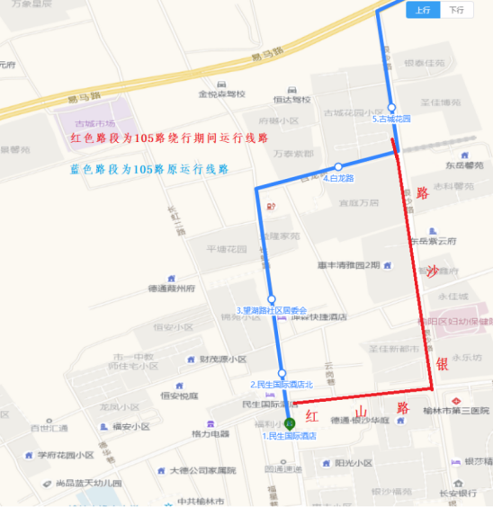 105路由民生国际酒店发车,原线行驶至红山路与长虹路十字右转,经红山路、银沙路后恢复原线运行。(上下行一致)(记者 苏珊)