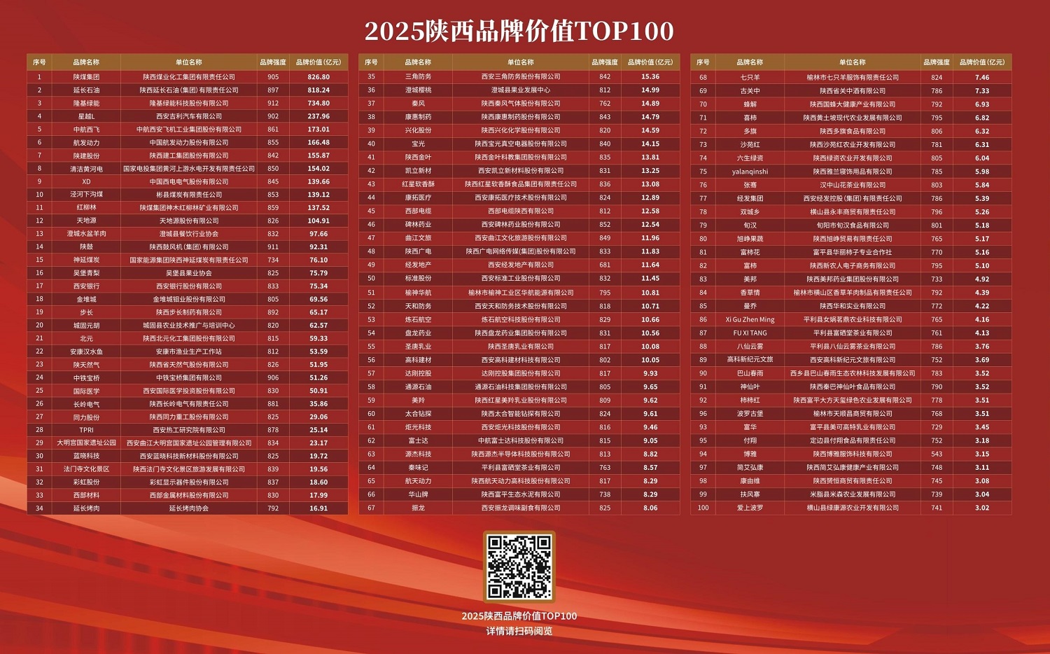 会上发布了《2025陕西品牌价值TOP100》榜单、2025陕西区域品牌(地理标志产品)品牌价值评价结果及2025年“陕西好商标”评价结果,集中展示陕西省品牌建设成效;同时,发布陕西区域公共品牌助力经济高质量发展成果案例,总结可复制推广的品牌建设范式。本次评价中,“银桥”“红星·软香酥”等122个商标获评2025年“陕西好商标”,“旭峥果蔬”等11个商标获评2025年“最具成长潜力商标”。截至目前,全省共有“陕西好商标”270个,涵盖食品、医药健康、农产品、设备制造等多个类别。品牌价值评价TOP100总价值达5407.61亿元,其中品牌价值超过100亿元的有13家;区域品牌总价值达6119.67亿元,其中品牌价值超过100亿元的地理标志产品有7个。