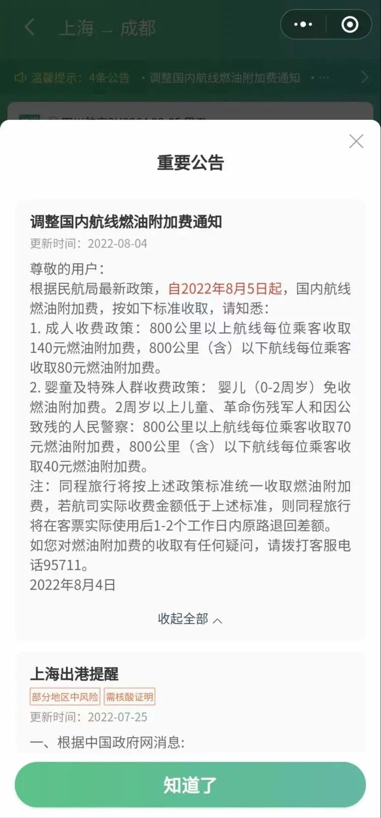 日前,多家航空公司发布公告,自8月5日(含)起销售的客票,将调整中国国内航线燃油附加费收取标准。航线距离800公里(含)以下航线燃油附加每航段收费标准为人民币80元;航线距离800公里以上航线燃油附加每航段收费标准为人民币140元。婴儿旅客免收;儿童、革命伤残军人、因公致残人民警察按实际收费标准减半收取。