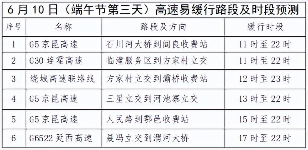 易缓行路段主要为:G30连霍高速、G5京昆高速、G65包茂高速、G3002西安绕城高速等高速部分路段。