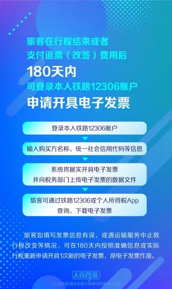 根据公告,旅客在行程结束或者支付退票(改签)费用后180天内(下称180天),可登录本人铁路12306账户申请开具电子发票,在输入购买方名称、统一社会信用代码等信息后,系统将据实开具电子发票,并向税务部门上传电子发票的数据文件。旅客可通过铁路12306或个人所得税APP查询、下载电子发票。
