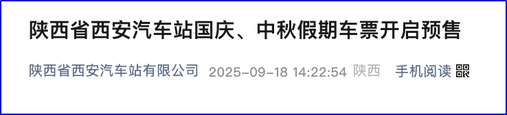9月18日,西西新闻记者从陕西省西安汽车站获悉,2025年国庆、中秋双节将至,预计9月30日、10月1日迎来客流高峰日。即日起,该汽车站开始预售国庆、中秋双节期间车票。