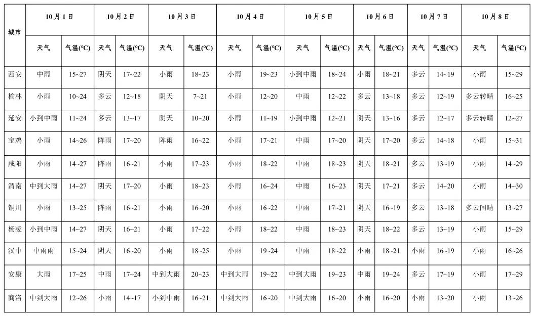 10月6日:陕北南部局地、关中部分地方小雨(0~5毫米),陕南小雨(0~10毫米),南部中到大雨(10~30毫米)。陕北日平均气温下降4℃左右。