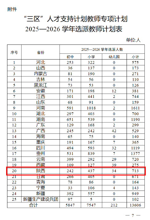 日前,教育部、财政部联合印发《关于做好2025年“三区”人才支持计划教师专项计划有关实施工作的通知》(以下简称《通知》)。2025—2026学年度全国计划选派13606名教师到“三区”(边远贫困地区、边疆民族地区和革命老区)支教,其中陕西计划选派713名(初中242名、小学437名、幼儿园34名)。