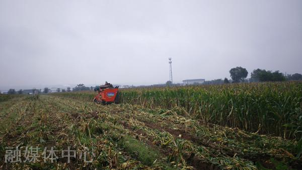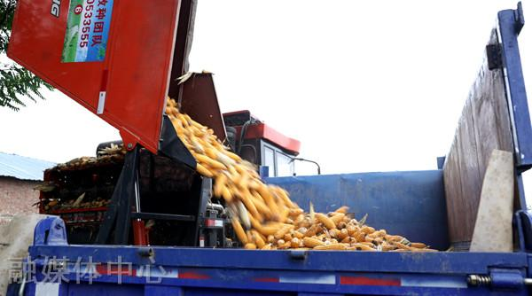 10月10日,在大程镇金尧村的农田里,履带式收割机在泥泞的玉米田间来回穿梭,履带碾过湿润的田垄,一次性完成玉米收割、秸秆粉碎还田等工序,金黄的玉米顺着输送筒源源不断倾泻至一旁的运粮车,抢收场景忙碌而有序。