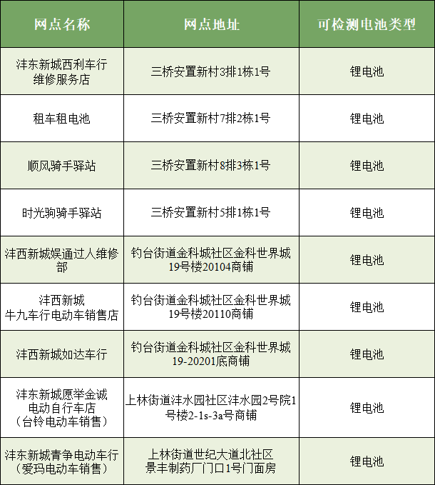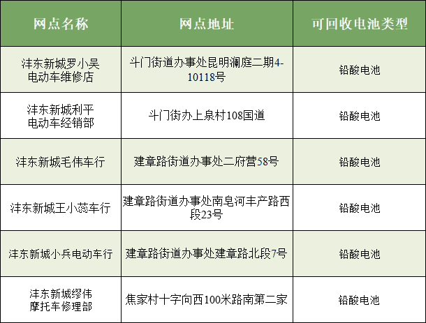废旧电动自行车电池含重金属,随意丢弃或由无资质主体处置,会渗入土壤、污染水源,破坏生态环境,广大市民如有回收需要,将废旧电池送至以下具备回收资质的网点,确保废旧电池规范、安全处置。