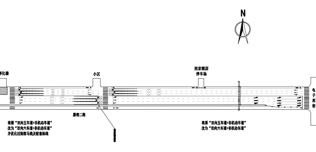 雁南二路紫薇西坊丁字口车道进行重新渠化,东口由双向六车道,拓展为双向七车道,在保证东口左转车道正常通行的情况下,匹配由东向西方向直行大流量车辆的通行,提升原有东西方向的通行效率。