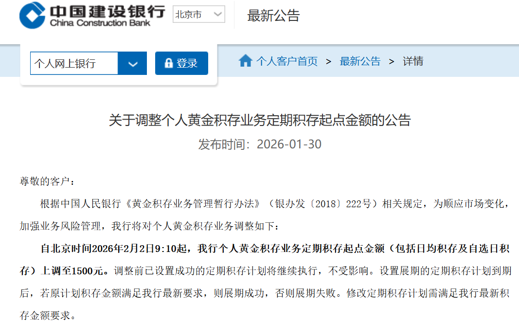 建设银行发布关于调整个人黄金积存业务定期积存起点金额的公告,自北京时间2026年2月2日9:10起,建设银行个人黄金积存业务定期积存起点金额(包括日均积存及自选日积存)上调至1500元。调整前已设置成功的定期积存计划将继续执行,不受影响。设置展期的定期积存计划到期后,若原计划积存金额满足建设银行最新要求,则展期成功,否则展期失败。修改定期积存计划需满足建设银行最新积存金额要求。后续将持续关注黄金市场变动情况,适时对上述起点金额进行调整。