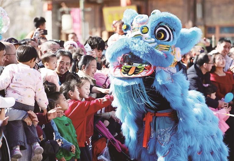 2月20日,在延安市红街街区,舞狮演员与游客互动。 新华社发(祁小军 摄)