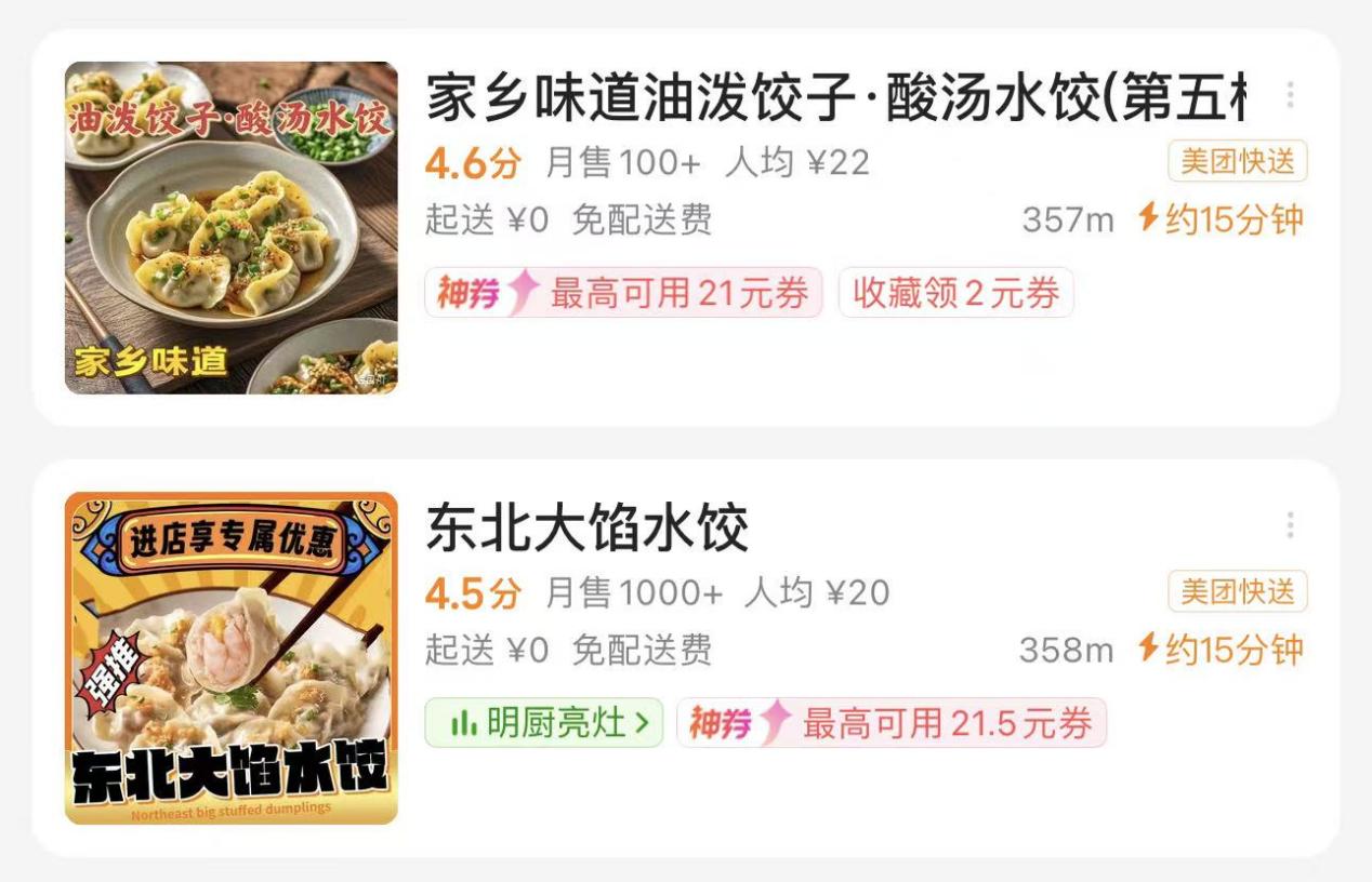 为进一步核实情况,记者逐一核查主流外卖平台,美团外卖、淘宝闪购上均能查到该地址下“家乡味道油泼饺子酸汤水饺”与“东北大馅水饺”两家店铺,看似独立经营,实则共用同一个营业执照;京东外卖仅能检索到“家乡味道油泼饺子酸汤水饺”,未发现“东北大馅水饺”相关店铺。
