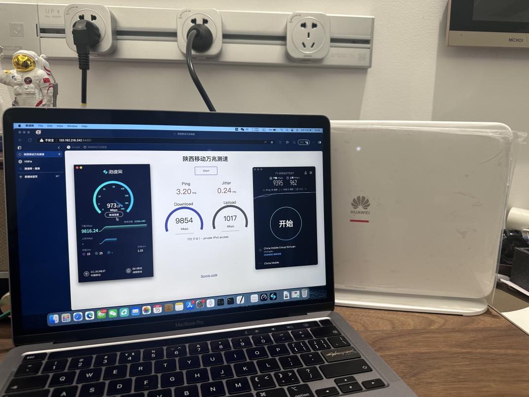 在核心网络建设领域,西安移动于2025年成功打造了全省首个万兆试点小区——高新区保利天悦小区,这一成果标志着西安正式迈入万兆光网时代。与千兆宽带相比,万兆宽带的速率提升了10倍。在西安市高新区保利天悦二期小区的万兆宽带用户家中,西安移动工作人员通过现场实测发现,上行带宽达到1000Mbps,下行带宽达到9800Mbps。