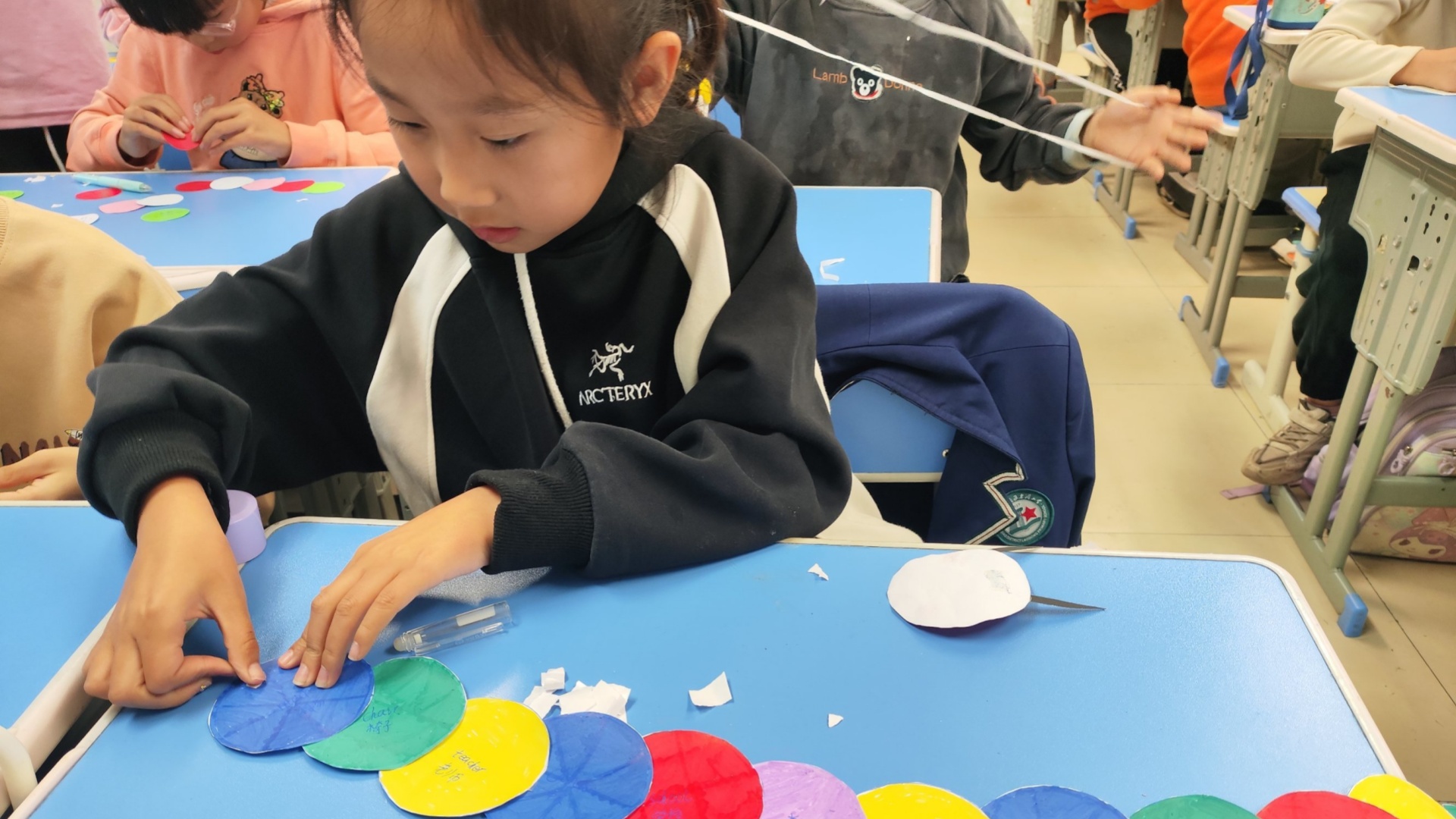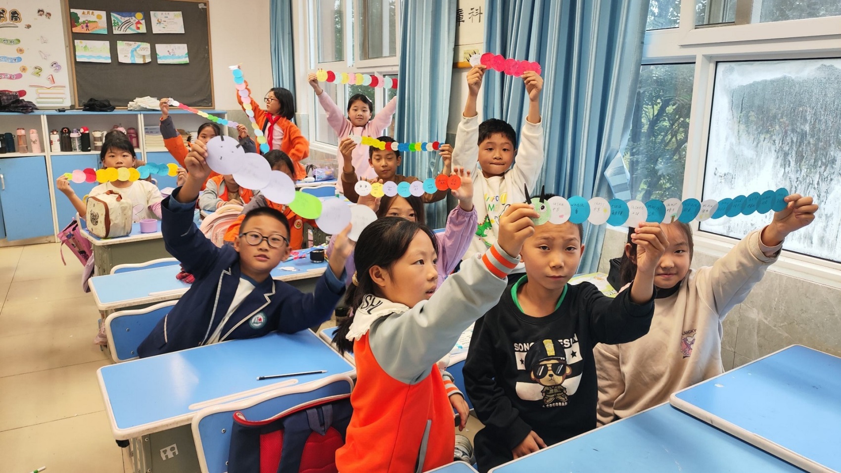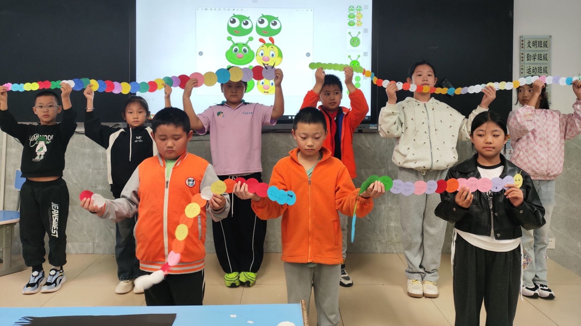 随后进入“毛毛虫零件包”准备环节,学生们用荧光笔为圆形卡片绘制彩色花纹,将平凡圆片变成“毛毛虫身体节”。他们将新学的“ch”单词如“chair”“cheese”等写在卡片上,每张卡片都成为藏着“ch”发音秘密的“知识宝藏”。最热闹的当属“组装环节”,学生们用固体胶将卡片首尾粘连,一条条色彩斑斓、形态各异的“单词毛毛虫”跃然桌上。