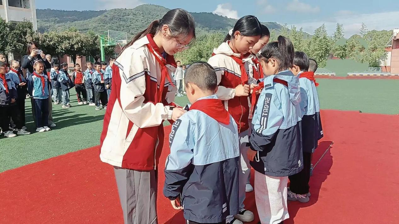 仪式在雄壮的出旗曲中拉开序幕。鲜艳的队旗迎风飘扬,准备入队的学生面带笑容,满怀欣喜与激动。全体少先队员齐唱《中国少年先锋队队歌》,嘹亮的歌声回荡校园。大队辅导员李白燕老师郑重宣读新队员名单,六年级老队员为新队员佩戴上鲜艳的红领巾。当红领巾在胸前飘扬时,新队员们在大队长寇鹏阳的带领下庄严宣誓,铿锵誓言彰显着“为共产主义事业贡献力量”的坚定决心。