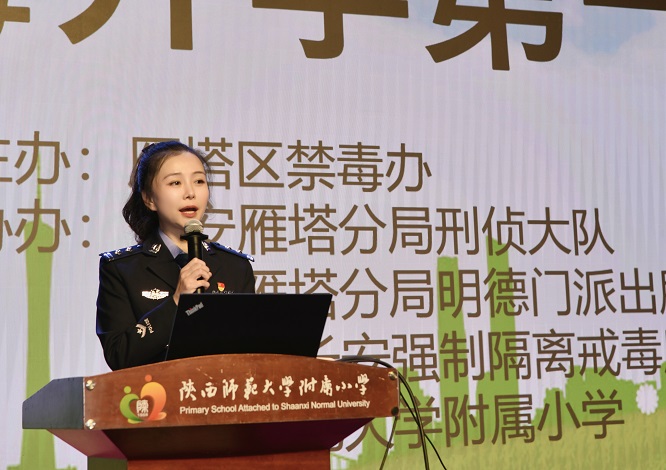 活动伊始,主持人、陕西师范大学附属小学法制副校长、公安雁塔分局明德门派出所副所长张娟向全体同学详细介绍了本次活动的举办背景与目的,强调青少年学习禁毒知识、树立防毒意识的重要性,要时刻牢记禁毒理念,从自身做起,远离毒品诱惑,养成健康向上的生活习惯。