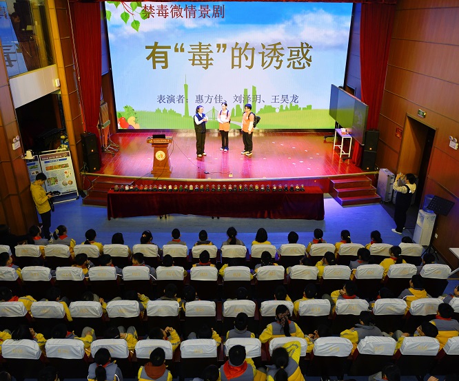 不同以往的活动方式,由禁毒社工自编自演的禁毒微情景剧“有’毒’的诱惑”,是本次活动的核心亮点之一。演员们以校园生活为背景,用贴近学生日常的场景,生动形象的教育方式揭示那些披着“时尚”“醒脑提神”外衣的新型伪装毒品,对青少年身心健康的危害,让同学们认识到毒品的威胁离自己并不遥远。演员们的表演鲜活细腻、代入感极强,台下同学看得全神贯注,完全沉浸在剧情之中。短剧结束后,现场久久回荡着同学们的掌声,同学们纷纷主动交流观后感,直言原来毒品会藏在这么常见的零食里,以后更会时刻擦亮眼睛,辨别身边的危险陷阱,争当“禁毒小卫士”,把防毒知识分享给身边伙伴。