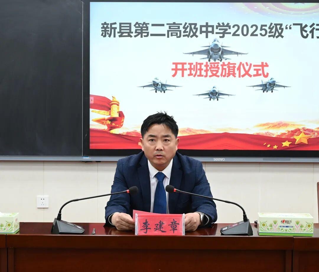 新县教体局党组书记、局长李建章发表讲话并为飞行班授旗。他代表县教体局,对新县二高“飞行班”顺利开班致以热烈祝贺。他强调,一流空军建设依靠一流飞行人才,一流人才培育始于一流招飞根基,新县二高创办“飞行班”,是紧跟国家人才战略、扛起国防教育责任的务实举措,更是老区教育扛起国防责任、助力强军事业的使命担当。他深切寄语:希望二高深耕红色育人,筑牢航空人才培育根基;希望同学们厚植家国情怀,扛起强国强军青春使命;希望同学们砥砺奋进前行,练就逐梦远航过硬本领。