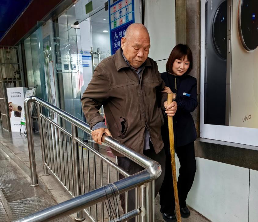 在西安移动草市营业厅门前,一位拄着拐杖的老人正颤巍巍地迈上台阶。值班经理见状,立即快步上前,稳稳扶住老人的手臂,一边轻声提醒“小心脚下”,一边小心护送他步入大厅。业务办理期间,工作人员全程协助,耐心讲解,确保老人顺利办结。