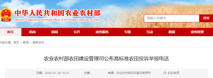 此次公布的电话主要受理高标准农田建设中涉及的农田灌排设施、田间道路、电力设施等工程质量问题。