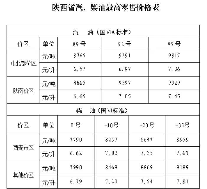 调整后,陕西中北部价区92号汽油最高零售价格为6.97元/升,95号汽油为7.36元/升;陕南价区92号汽油为7.05元/升,95号汽油为7.45元/升。西安市区0号柴油最高零售价格为6.62元/升,其他价区为6.79元/升。