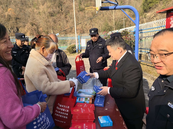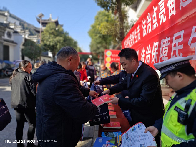 清晨的商南县政府广场,红色横幅迎风招展,法治展板整齐排列。民事审判庭、刑事审判庭、立案庭的干警们早早搭起讲台,将《中华人民共和国宪法》读本、法治宣传手册等资料整齐摆放。"宪法不是冰冷的条文,而是守护大家合法权益的'权利保障书'。"干警们用通俗易懂的方言,结合婚姻家庭、邻里纠纷等典型案例,向过往群众解读宪法的规定、原则及精神,重点宣讲习近平法治思想和党的二十届四中全会关于法治建设的部署要求。