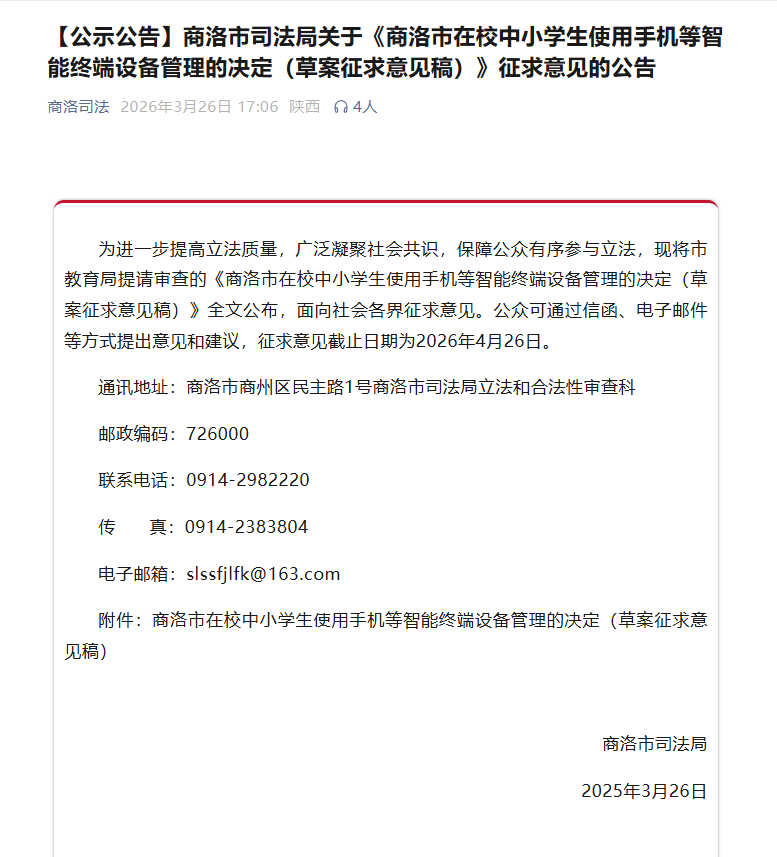 为进一步提高立法质量,广泛凝聚社会共识,保障公众有序参与立法,现将市教育局提请审查的《商洛市在校中小学生使用手机等智能终端设备管理的决定(草案征求意见稿)》全文公布,面向社会各界征求意见。公众可通过信函、电子邮件等方式提出意见和建议,征求意见截止日期为2026年4月26日。