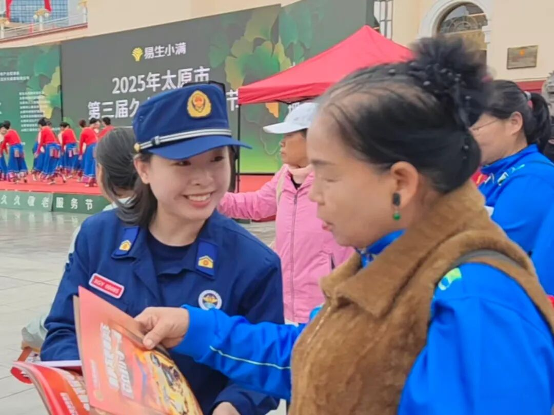 近日,在太原市第三届久久敬老服务节南宫广场现场,太原消防设立宣传展台,针对老年群体开展专题宣传。宣传人员通过讲解常见火灾隐患、组织逃生帐篷体验、发放安全手册等方式,生动普及用电用火安全注意事项及应急避险技能,有效提升了老年人的消防安全认知水平。