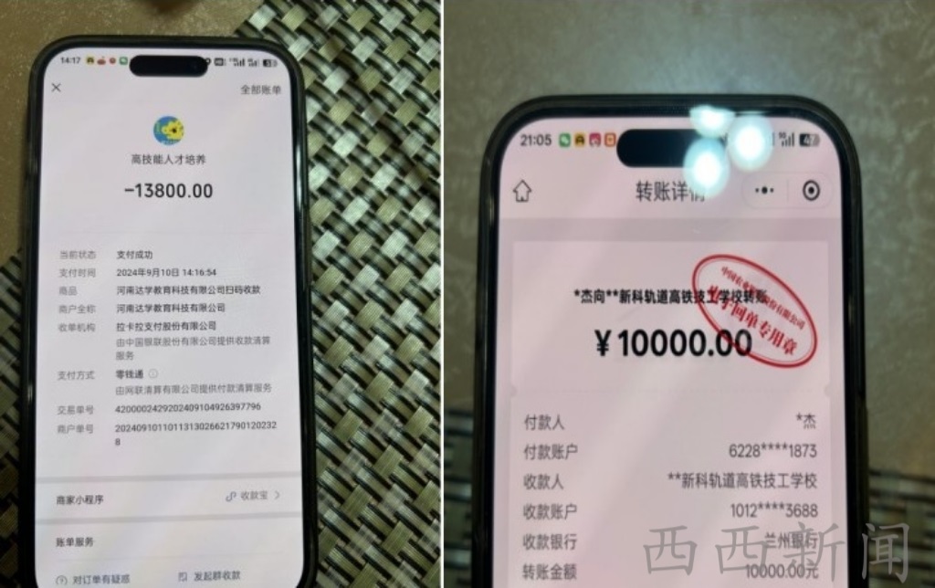 按照招生老师的指引,家长们开始缴纳第一学年的费用。然而,在付款环节,一些细心的家长发现了不寻常之处。家长王女士向西西新闻记者提供的转账记录显示,她分两笔支付了总计两万多元的费用:其中一笔学费汇入了一个户名为“甘肃新科轨道高铁技工学校”的兰州银行对公账户;另一笔则通过扫码,支付给了一家名为“河南达学教育咨询有限公司”的企业。