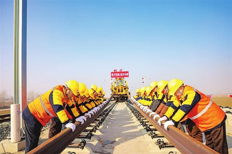 近日,中铁三局将首对500米长钢轨平稳、精准地铺设在雄忻高铁跨京广铁路特大桥无砟道床上,这标志着雄忻高铁正式进入铺轨施工阶段。